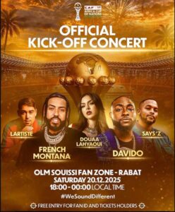 As anticipation reaches a crescendo for the TotalEnergies CAF Africa Cup of Nations (AFCON) 2025, organisers have unveiled a spectacular musical line-up featuring global stars French Montana and Nigerian superstar Davido at a high-profile concert in Morocco ahead of the tournament’s kick-off. The event is being positioned as one of the most ambitious entertainment programmes ever staged alongside the continent’s premier football festival.